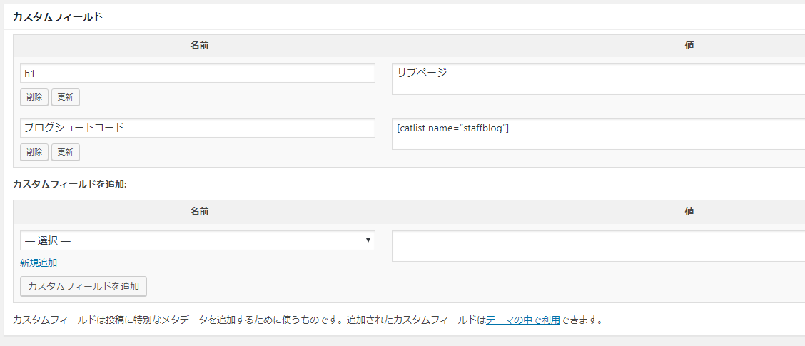 作成画面のコンテンツを追加した項目のすぐ下にある「カスタムフィールド」という項目を開きます。